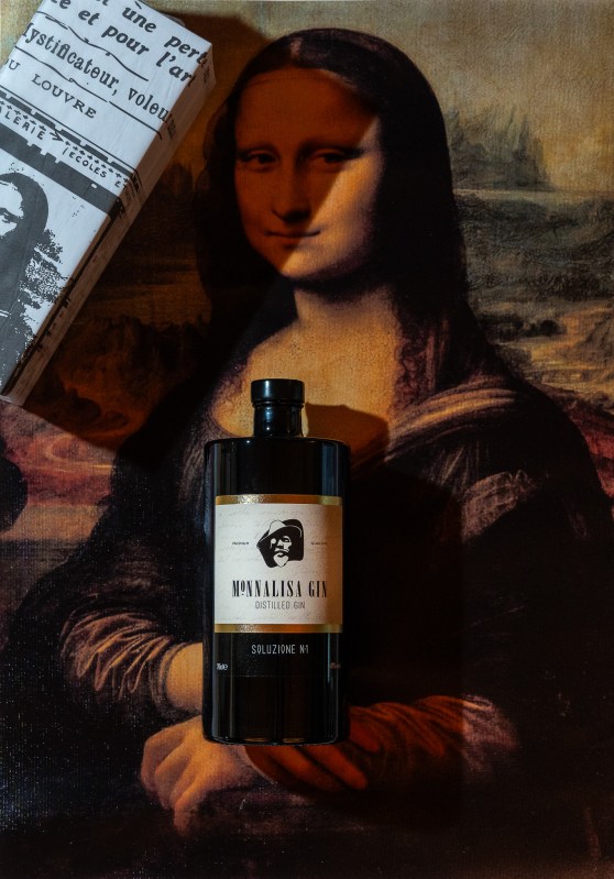 The bottle bears many references to the story of the thief of the Mona Lisa. Some examples: the