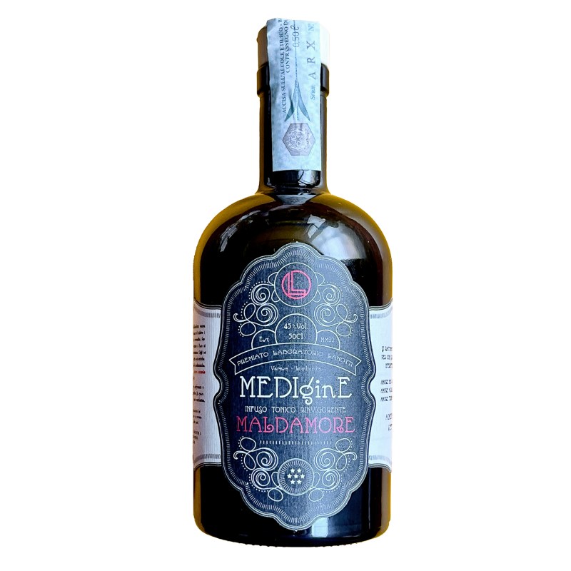 Hence the idea of transforming Maldamore into a real medicine, (with irony of course), as a remedy for heartaches, accompanying it with a green pharmaceutical bottle and graphics that somewhat resemble those of the ancient herbal preparations. complete with dosage (see label).