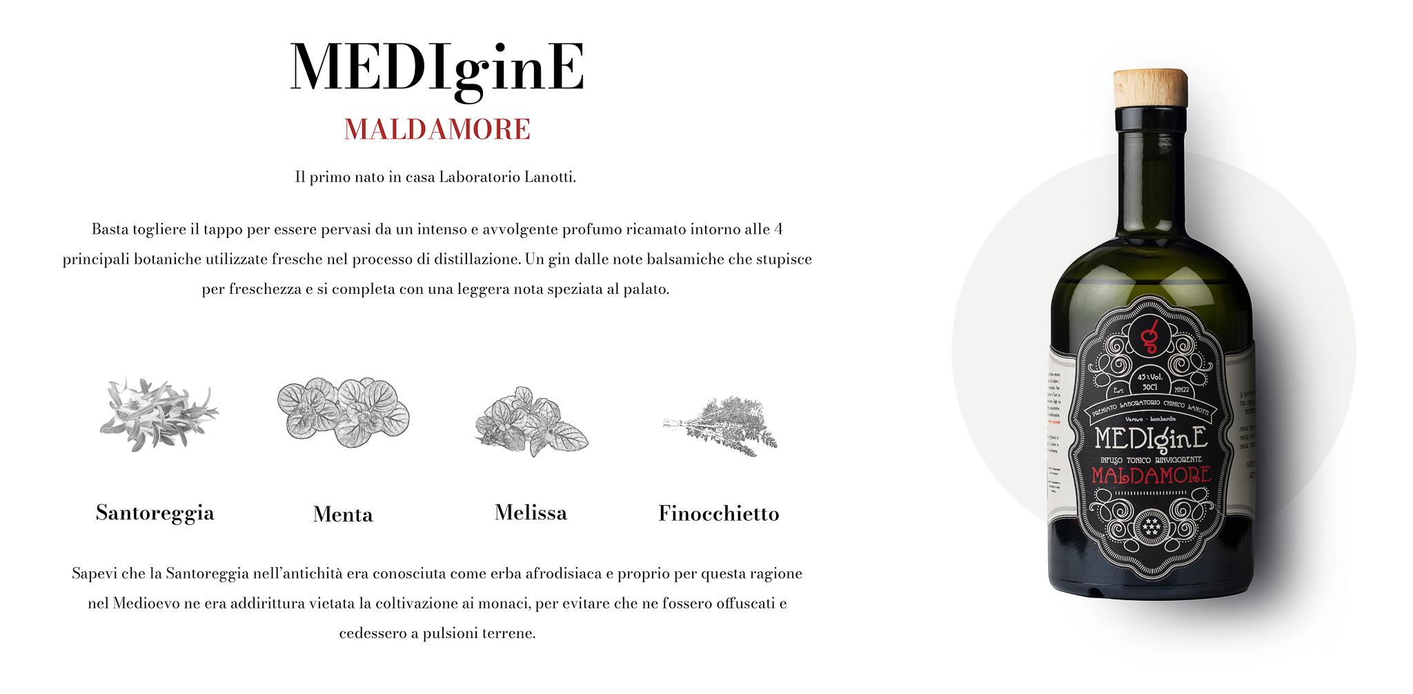 Maldamore nasce intorno a 4 erbe utilizzate fresche nel processo di distillazione, una in particolare, la santoreggia, un’erba che nell’antichità era conosciuta ed utilizzata come afrodiasiaco.
