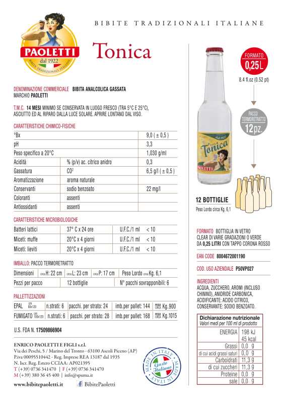 It is one of the relatively more recent products of the Paoletti company. The taste deriving from the Cinchona extract makes the drink very suitable for summer use as a thirst quencher with the classic slice of lemon.